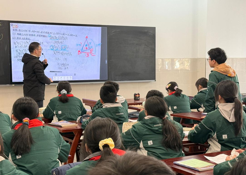 抵达新城中学后,在该校教师的统筹安排下,同学们有序进入初中数学课堂开展观摩学习。授课教师紧扣新课标要求,以清晰教学脉络、精准重难点把控构建课堂体系,既细致拆解定理概念逻辑,一步步引入与解析未知量与已知量的关系,直观呈现勾股定理作为解题“桥梁”的连接作用,又注重定理与知识体系的关联衔接,先引入基本事实平行线分线段成比例定理,再逐步探索相似三角形的条件运用,尽显知识讲授的严谨性;同时融入图形实例、实操探究等多元教学形式,让课堂更具趣味性与感染力。